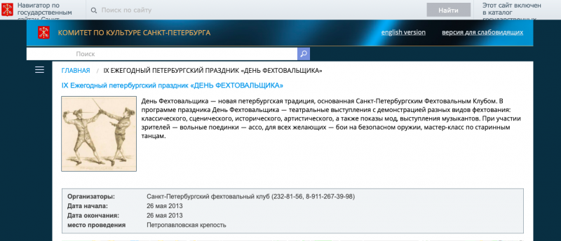 14.00-16.00 Фехтовальный спектакль, посвященный 310-летию Санкт-Петербурга.