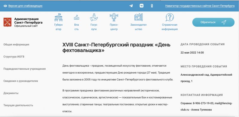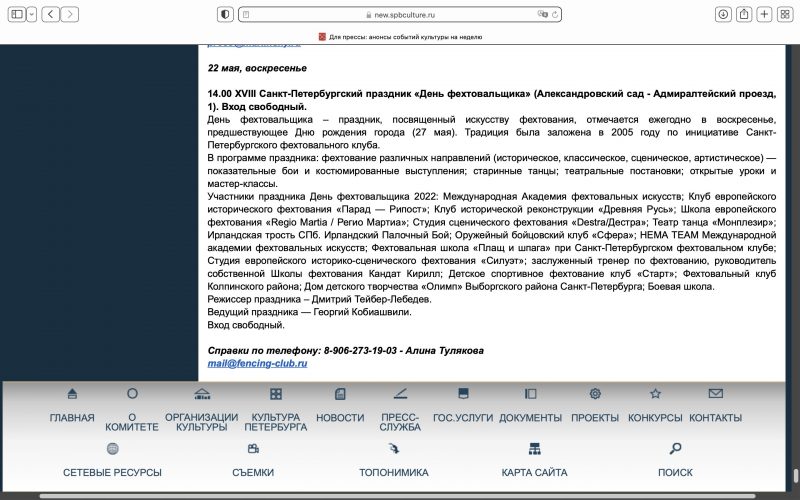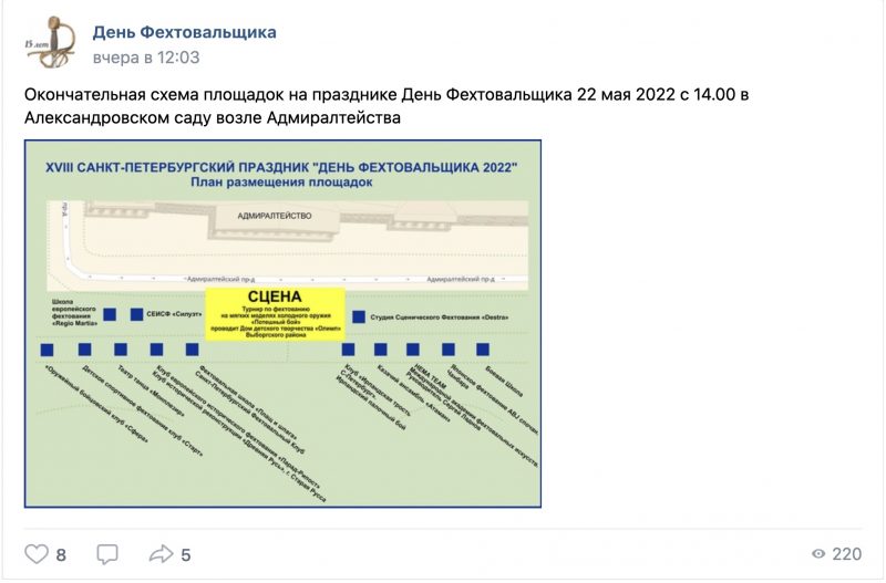 Санкт-Петербургский Фехтовальный Клуб приглашает на уже ставшее доброй городской традицией празднование Дня фехтовальщика. XVIII международный петербургский праздник состоится 22 мая 2022 в Александровском саду у стен Адмиралтейства. Мероприятия пройдут с 14:00 до 18:00. Вход свободный.